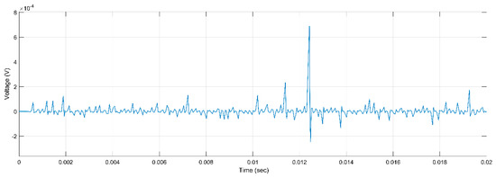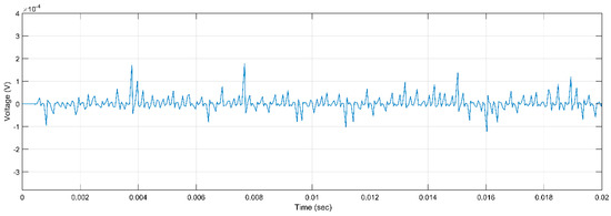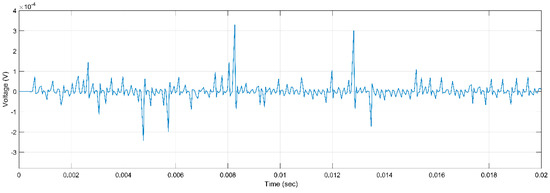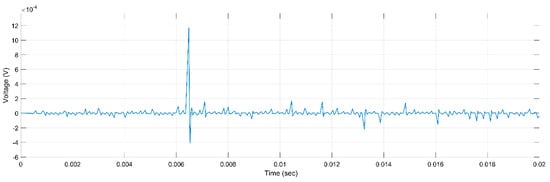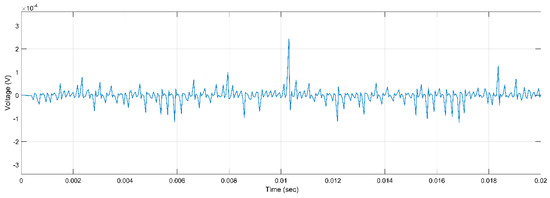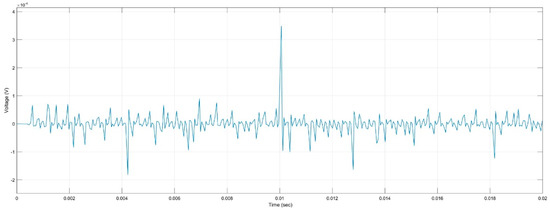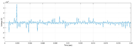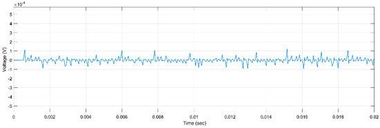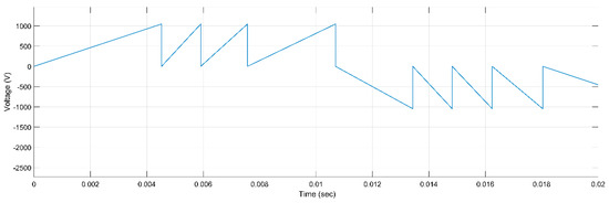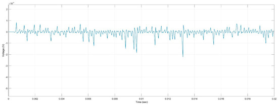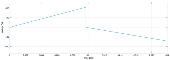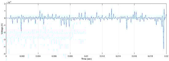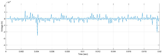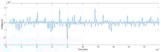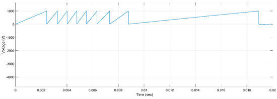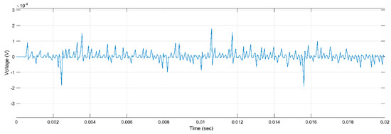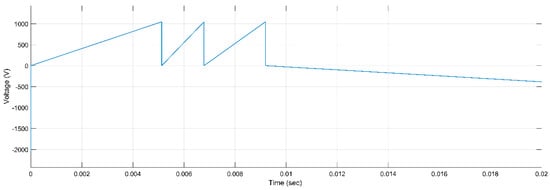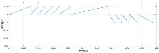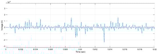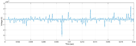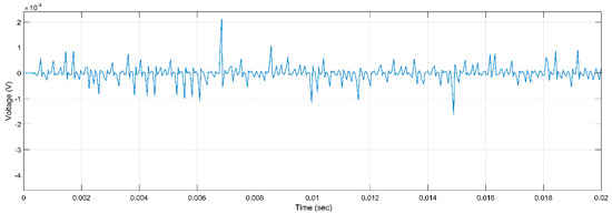 Various results for each insulation material and different geometries of the cylindrical void are indicatively presented in Figure 3, Figure 4, Figure 5, Figure 6, Figure 7, Figure 8, Figure 9, Figure 10 and Figure 11, where the flashover voltages (FVs) per time are shown. The following diagrams show that the geometry of the enclosed void as well as the applied voltage play a vital role in PD activity, i.e., when the aforementioned factors increase, the number of PDs increases as well. Another factor examined is the insulation materials, and it is obvious that the combination of the two insulation materials has the lowest number of PDs, while mica has more PDs and a smaller maximum PD amplitude.