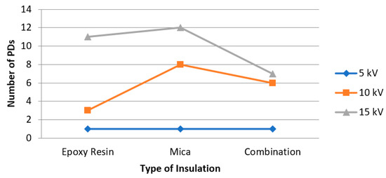 When the void increases either by increasing the height or the radius, the number of PDs increases. Moreover, the number of PDs increases when the applied voltage increases. The combination of the two insulation materials presents the lowest number of PDs, and mica seems to achieve the best results, while ER presents the fewest number of PDs and mica the maximum apparent charge, while ER the smallest.