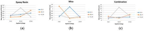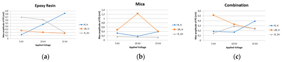Maximum amplitude of PD for the 1st model for ER (a), mica (b), and combination (c).