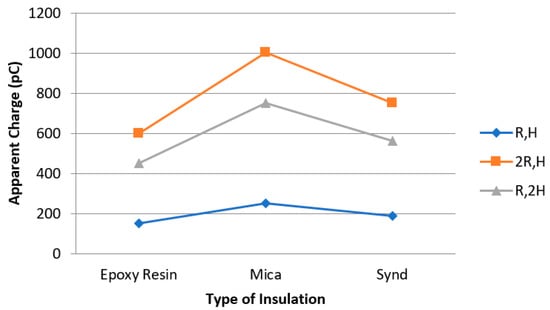 Insulation materials play a vital role in PD activity. ER, mica, and the combination of these two materials were investigated. First of all, as we can see in Figure 33 and Figure 34, in most simulations ER seems to present the largest PD amplitude, while the lowest is presented by mica. In most simulations, the lowest number of PDs is observed for the combination of the two materials. This is an important reason why it is preferred that the insulation system of many EMs, and especially SGs, is a combination of mica and ER. It is important to note that the following figures were created using data from simulations with the same parameters.