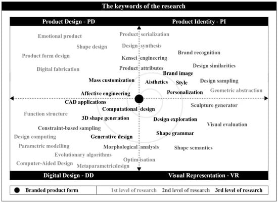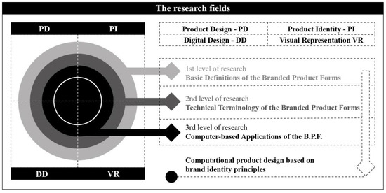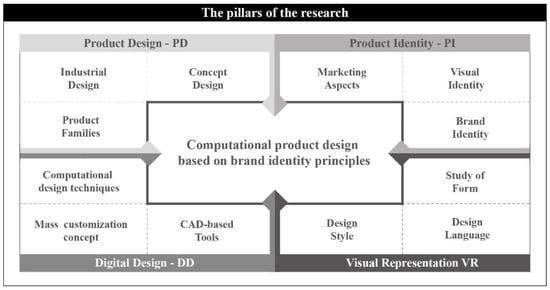 The current work deals with mass customization product design through computational design methodologies and techniques in order to develop innovative and unique forms. The perception of the brand identity approach links with the parametrization of the visible elements of specific branding strategies (e.g., shape, geometry, form, color, texture, type of assembly, packaging, etc.). The aforementioned design theory deals with a general design management framework for helping designers in translating all of the stakeholders’ requisites into operative procedures for the development of more sustainable products. The core concept of the proposed design strategy is the customized design of products according to end users’ needs and desires. The present paper depicts research studies that are related to the concept of computational product design, based on brand identity principles, in the last 15 years. The presented studies refer to four specific design pillars of modern product design: product design (PD), digital design (DD), visual representation (VR), and product identity (PI). Each design pillar includes three different core research areas. These proposed research areas are used for the in-depth understanding of the main research problem, the research goals, and finally, the research questions. More specifically, the research field of product design (PD) consists of the terms (a) industrial design, (b) concept design, and (c) product families. Then, the next pillar of digital design (DD) includes the scientific areas: (a) CAD-based tools, (b) computational design techniques, and (c) mass customization concept. The third pillar of visual representation (VR) is a combination of these specific areas: (a) the study of form, (b) design language, and (c) design style. Finally, the design pillar of product identity (PI) consists of the following terms: (a) visual identity, (b) brand identity, and (c) marketing aspects. The full concept of the research areas is depicted in Figure 1. As has already been noted, each research field includes three specific keywords, which support the correlation between the computational design field, the product design, the product identity, and finally, the visual representation aspects. The next section of the research work describes the four pillars of the research in more detail according to the literature survey.
