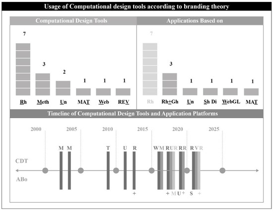 Figure 4 summarizes the usage of computational design tools according to the creation of branded product forms. From 2000 to 2015, a great number of methodological tools (Meth & M) were used to support computational thinking approaches (e.g., shape grammar theory, etc.). Apart from that, the well-known software MATLAB (MAT & T) had a significant role in the aforementioned procedures. It is important to note that some authors do not specify the computational design tools from their point of view (Un). Finally, in the last five years, Rhinoceros (Rh & R) and Grasshopper (Gh & G) have been used as the main basic computational tools. On the other hand, the applications’ development deals with specific pieces of software, web-based platforms, and programming languages, e.g., Shape Diver (Sh & S), Revit (REV & V), Unity (U), and WebGLTM (W).