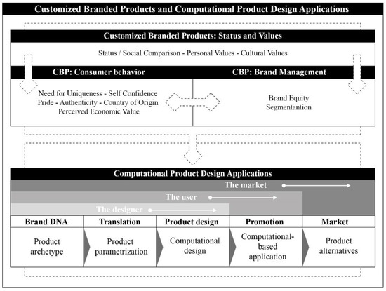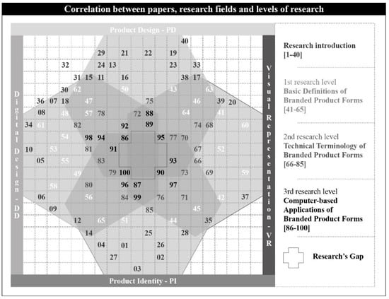 The key areas of research on computational product design based on branding identity are organized using an evolutionary dashboard. Figure 5 presents a correlation between the research papers, the research fields, and the levels of the investigation. More specifically, Figure 5 presents an overview where only the scientific papers mentioned in this paper are recorded. The positions of the proposed references in the table indicate their relationship with respect to the research gap located in the center. The key theory behind the research gap is to explore how a design process can serve an important function in telling the story of the brand according to the visual elements.
