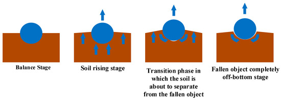 When a fallen object is salvaged from the seabed, it is subjected to the adsorption force of the mud. The adsorption force is generally the interaction between the structure, the soil, and the liquid, which is usually water. The adsorption force consists of three elements: the adhesion between the soil and the bottom surface of the object’s structure, the negative water pressure generated during the lifting of the structure, and the lateral frictional resistance generated between the soil and the side of the structure. When the lifting starts, the soil is deformed by the adsorption force and friction resistance. When the critical point of the adsorption force is reached, the soil on the bottom of the structure starts to separate from the structure surface; however, the soil on both sides of the structure has not been separated completely. Although the soil is separated from the structure’s bottom, the soil on both sides is still lifted with the structure until a new equilibrium is reached again. As the lifting continues, the soil on both sides moves again and separates from the surface of the structure until the structure is fully lifted up and away from the mud. The movement of the fallen object and the soil is illustrated in Figure 1.