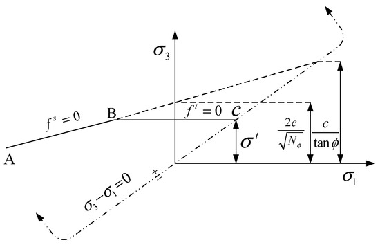 The combined Mohr–Coulomb criterion with the tensile failure is shown in Figure 2.