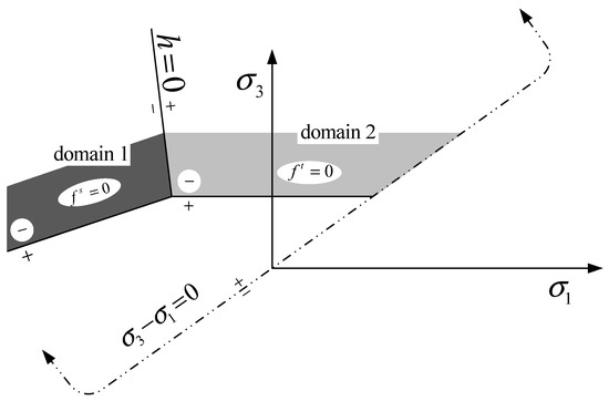 Different laws are chosen by defining the region in which the stress point is located. As shown in Figure 3, this is the formula that defines the positive and negative domains: