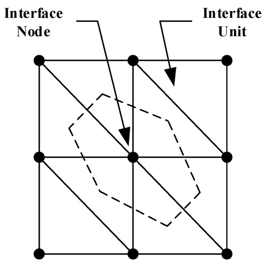 The interface cells are assigned as a triangle, so that any node on an interface corresponds to an associated area. The area of any quadrilateral is defined by two triangular interface cells; nodes are located at the vertices of each interface cell, and interface nodes are formed when an interface cell connects to another mesh surface, as shown in Figure 4.