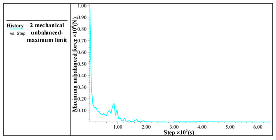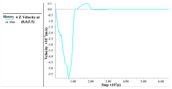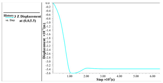 In Figure 9, it can be seen that the maximum unbalanced force ratio gradually tends to zero as the time steps increase, until finally the system reaches equilibrium under gravity. However, it is necessary to observe the changes in velocity and displacement in the model to ensure they converge to constants so as to further verify that the system has reached true equilibrium. The node at the bottom of the object was selected, and the time-step curves of its velocity and displacement in the z-direction were plotted, as shown in Figure 10 and Figure 11. It can be seen that as the time step increases, the velocity of the node at the bottom approaches zero and the displacement gradually approaches a constant, which shows that the system has reached true equilibrium.