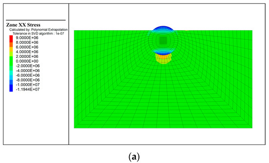The x- and y-directional stresses are nearly constant in most of the area, and the stress concentration occurs only on the top, bottom, and both sides of the object, as shown in Figure 12a,b. This is due to the gravity-produced displacement of the object in the negative direction of the z-axis and the lateral displacement of the soil close to the object under the effect of hydrostatic pressure. From the z-direction stress, it can be seen in Figure 12c that the stress concentration appears on both sides of the object. The reason for this is that the solid structure on top of the object is compressed by the weight of the soil on both sides. At this moment, the maximum compressive stress is 19.8 MPa.