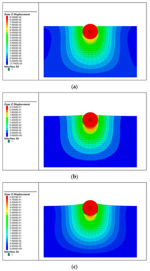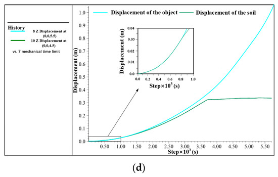 The simulation of the object moving out of the mud is shown in Figure 13. The object starts to move up, but the bottom of the object does not separate from the soil (no gap) because of the adsorption force of the silty soil under the action of the upward lifting force, as shown in Figure 13a. As shown in Figure 13b, the soil at the bottom is subjected to an upward tensile strain, and the tensile strain in the middle of the soil gradually increases, and the soil at the bottom is about to be separated. Figure 13c shows that as the upward tensile strain continues to increase, the soil close to the bottom of the object starts to separate from the object because of gravity, and a gap is produced. With an increase in the tensile strain, the gap extends until the mud is separated from the object. As illustrated in Figure 13d, it can be seen that at the beginning, the displacements of the object and the bottom soil are equal to each other. As the time increases, the bottom soil displacement becomes less than that of the object, and the gap is produced; this difference increases with time until the displacement of the mud stops increasing and the object is fully out of the mud.