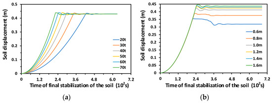 Soil displacements with different lifting forces are plotted in Figure 19a. With a big lifting force and the same burial depth, the soil displacement stops increasing sooner, and the off-mud process is also completed earlier. When the burial depth is increased with the same lifting force, the maximum soil displacement increases. When the burial depth is decreased with the same lifting force, the displacement stops increasing slightly earlier, as shown in Figure 19b.