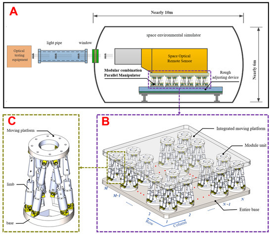 A modular combination parallel manipulator (MCPM) is developed for the optical axis alignment of a space optical remote sensor with an aperture over two meters in a space environment simulator. As depicted in Figure 1, the modular combination parallel manipulator (MCPM) comprises M × N 6-DOF parallel platforms, each module unit consisting of a moving platform, base, and 6-UPU limbs. Each base is connected to the entire base, and each moving platform is connected to the integrated moving platform. The space optical remote sensor is installed above the integrated moving platform. A rough adjustment device and MCPM are used to achieve rough and accurate optical axis alignment in the space environment simulator. First, the space optical remote sensor opens the imaging function and makes the target in the light pipe within the imaging range by adjusting the rough adjusting device. Then, make the target in the middle of the image by adjusting the MCPM.