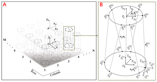 As illustrated in Figure 2A, an integrated moving coordinate system and an entire base coordinate system are established in the MCPM. The coordinate frame is located at the center point P of the integrated moving platform. The coordinate frame is attached to the entire base at its center point O. As depicted in Figure 2B, a module moving coordinate system , module base coordinate system , and six limbs coordinate system are established in the module unit ij, which is located in row i and column j. The coordinate frame is located at the center point of the moving platform. The coordinate frame is attached to the base at its center point . Six limb coordinate systems are fixed to each limb and located at the center of the joint connecting the base and the limb. The axis points from to ; the axis is parallel to the cross product of two unit vectors of the and axes; the axis is defined by the right hand. The frame and are in parallel. The frame and are also in parallel.