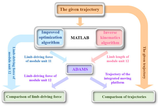 MATLAB and ADAMS software are used for co-simulation. the simulation flow chart is depicted in Figure 5. In ADAMS, the limb of module unit 11 is driven by force, and the limb of module unit 12 is driven by motion. The penalty coefficient w is set to 500, and the given trajectory of the integrated moving platform is defined by Equation (27), where , , and are the translational motion in frame with time, , , are the Tait–Bryan angles extrinsic rotations motion in frame with time. The rotation is defined as follows: a rotation of about the fixed axis followed by a rotation of about the fixed axis and a rotation of about the fixed axis. The given position and attitude are illustrated in Figure 6A,C. The position and attitude results of the ADAMS simulation output are illustrated in Figure 6B,D. Based on Figure 6, the given trajectory and ADAMS outputs trajectory are almost identical. This finding confirms that the inverse kinematics is correct. The MATLAB and ADAMS simulation results of the limb-driving force of the module unit 12 are depicted in Figure 7. Based on Figure 7, the output driving force of each limb is identical from different software, verifying correct inverse dynamics.