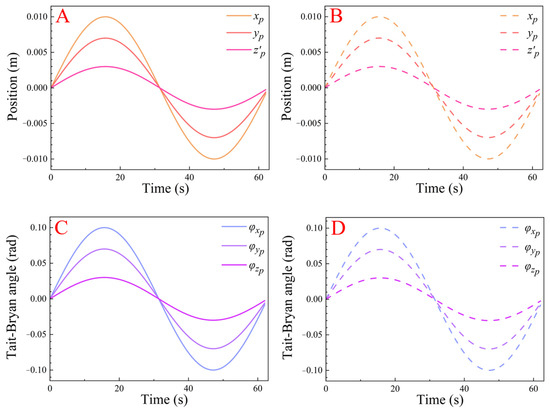 Comparison of trajectories: (A) given position trajectory, (B) ADAMS outputs position trajectory, (C) given attitude trajectory, and (D) ADAMS outputs attitude trajectory.