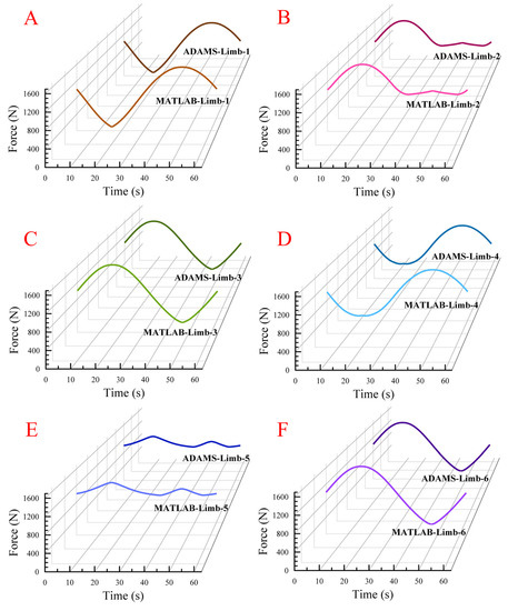 Simulation results of limb-driving force of the module unit 12 from MATLAB and ADAMS software:(A) 1 th limb, (B) 2 th limb, (C) 3 th limb, (D) 4 th limb, (E) 5 th limb and (F) 6 th limb.