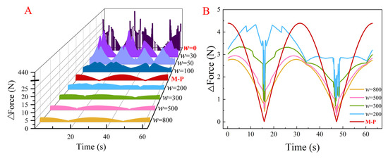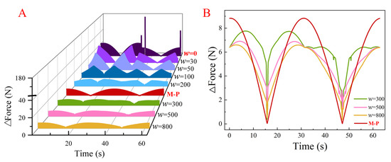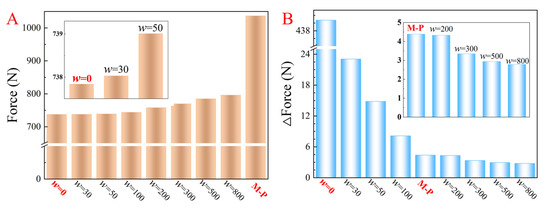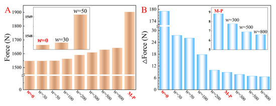 The maximum driving forces and force mutations of the three types of optimization methods are depicted in Figure 12 and Figure 13 (each column takes the maximum of the absolute value of the driving force or force mutation of the entire trajectory as source data). Based on Figure 12 and Figure 13, for the entire trajectory, compared with the minimize-the-maximum driving force method, the maximum force value increases slightly after introducing the penalty term, but the force mutation decreases significantly. Moreover, by choosing appropriate penalty coefficients (w = 300, 500, and 800), the maximum driving force and force mutation are both smaller than the M-P method. In particular, the maximum driving force decreased significantly.