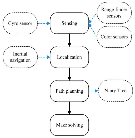- Del Rosario, J.R.B.; Sanidad, J.G.; Lim, A.M.; Uy, P.S.L.; Bacar, A.J.C.; Cai, M.A.D.; Dubouzet, A.Z.A. Modeling and characterization of a maze-solving mobile robot using wall follower algorithm. Appl. Mech. Mater. 2014, 446, 1245–1249. [Google Scholar]