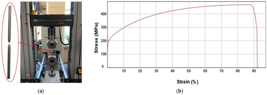 The mechanical properties of the wire, namely, tensile strength, yield strength, and residual elongation, were determined by the static tension method according to GOST 1497-84 on an Instron 5882 tensile testing machine (Figure 3) [38].