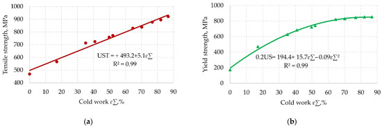 Therefore, to build an accurate energy-power mathematical model of the drawing process, it is necessary to know the equations for changing the tensile strength and yield strength of the alloy under study from cold work.