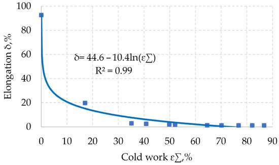 Evaluation of plastic properties, namely relative elongation, is also important for the drawing process. To evaluate the change in plastic properties during cold work, the equation shown in Figure 5 was obtained from the results of tensile tests.