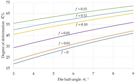 The nomogram of calculated values of the degree of deformation from the die half-angle and the friction coefficient is shown in Figure 7.