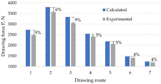Figure 9 shows that the calculated drawing forces are greater than the experimental ones by 4–9%. This may be due to the fact that in the calculations, we took the friction coefficient equal to 0.05. In real conditions, its value could be lower. However, for carrying out analytical studies of the influence of technological parameters on energy and power parameters in the design of drawing routes, the adequacy of the developed mathematical model is very good. The calculation error does not exceed 10%. In turn, it would be useful to evaluate the effect of the friction coefficient and the die half-angle on the energy-power parameters by the calculation method.