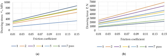 Also, the developed mathematical model makes it possible to evaluate the influence of technological parameters on energy and power parameters. As an example, we present the results of calculations that show how the drawing stress and drawing force change with a change in the die half-angle (Figure 10) and friction coefficient (Figure 11). As you can see, a decrease in the half-angle of the die leads to an increase in the drawing stress (Figure 10a) and the drawing force (Figure 10b). This is due to the fact that, at a constant degree of deformation, a decrease in the half-angle of the die leads to a decrease in the contact zone between the wire and the die. A decrease in the contact area should lead to a decrease in the drawing force, which is confirmed by calculation results. However, with an increase in the half-angle of the drawing die, the conditions for injecting technological lubricant into the deformation zone worsen. The deterioration of the efficiency of the lubricant leads to an increase in the coefficient of friction. Calculated results of the effect of the friction coefficient on the drawing stress and the drawing force are shown in Figure 11. As we can see, in Figure 11, a change in the friction coefficient by 0.02 leads to an increase in the drawing stress and drawing force by 20%.