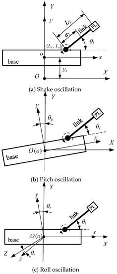 Moreover, denotes the global frame; is base-fixed frame; , and denote shake, pitch and roll base oscillations, respectively; is link’s angular position; denote link length; , is the position of link joint point; is the length between link’s centroid and joint point.