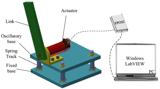 Before developing the hardware experiment platform, a virtual prototype system is firstly constructed. It is shown in Figure 3. The system consists of a one-link manipulator, a mounted frame (the oscillatory base), spring-tracks and a fixed base. The manipulator together with the mounted frame can oscillate along the tracks under external excitations. The spring is used to simulate the role of the vehicle shock absorber. The manipulator is actuated by a DC motor, and the motor is driven by the computer instructions through a digital position controller.