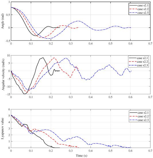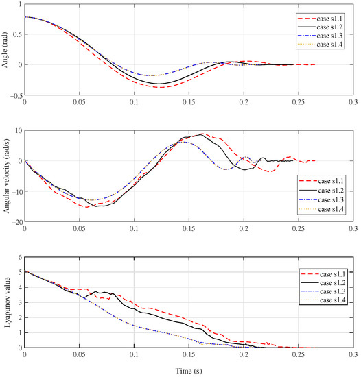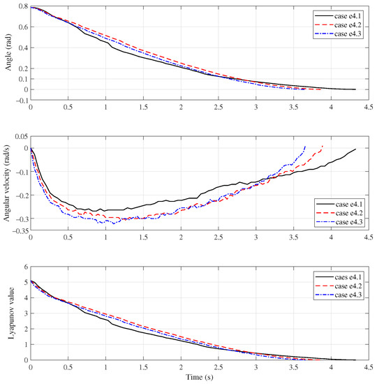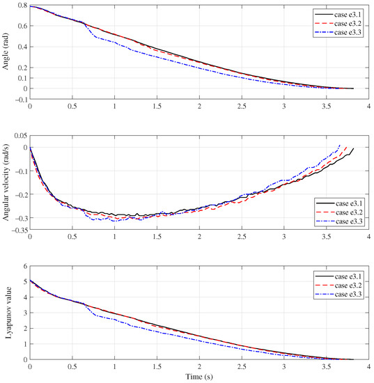 The upper subfigure of Figure 16 depicts the angular trajectory of the manipulator, the middle one presents the angular velocity curves. It is clear that the control has achieved the accuracy positioning control of the manipulator. It steers the system arriving at the equilibrium point in 3.872 s, 3.737 s and 3.663 s, respectively. It can also been seen that the angular velocity curves are still non-smooth. Moreover, the lower subfigure shows the time history of the monotonic decreasing function V.