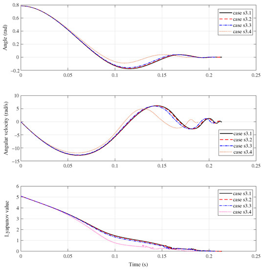 The simulation results are presented in Figure 16 and Figure 17. Figure 16 illustrates the system response. The black solid line corresponds to the case e3.1, and the red dash line case e3.2, the blue dash-dot line the case e3.3.