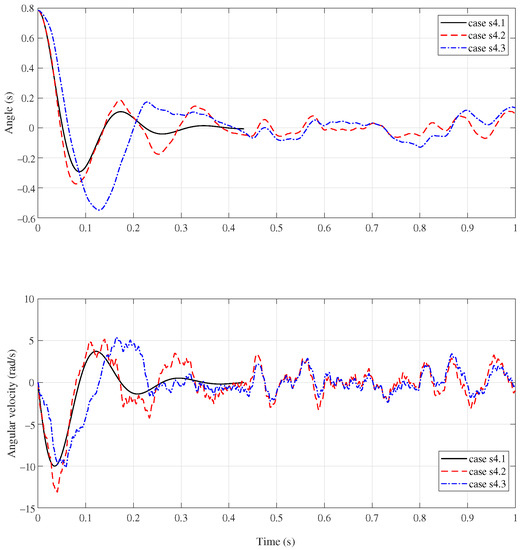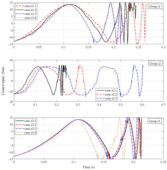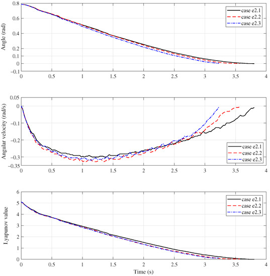 From the upper two subfigures of Figure 14, it can been seen that the manipulator is steered from the given state to the terminal state in short time. The setting time for the case e2.1, e2.2 and e2.3 are 3.81 s, 3.56 s and 3.23 s, respectively. Similar with the Group e1, the bigger the payload uncertainty, the less the setting time. The reason is the same as the Group e1. We can also find that the angular velocity curves of this group exhibit more obviously oscillating feature than the Group e1.