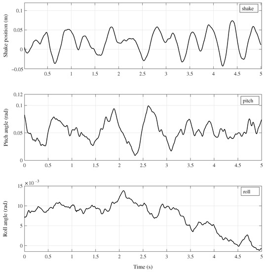 The lower subfigure depicts the time history of the Lyapunov function V along the system trajectory. It can been seen that the Lyapunov function curve for the case of roll and no oscillation is decreasing monotonically, but for the case of shake and pitch oscillation it is not. This is because that the setting of depends on the value of , but the value is not easily to confirmed in practice. A simple estimating value is selected in this study. Nonetheless, the proposed controller still demonstrated good robustness to real oscillations.