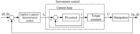 The EPOS2 controller has a build-in control loop. It is a kind of three-loop control method, which consists of a current loop, a position loop and a velocity loop. For our experiments here, the embedded current-loop is adopted, but the position-velocity loop is replaced by our self-build control loop. The current-loop uses the proportional-integral control. The position-velocity loop is a real-time program of the proposed implicit-Lyapunov control. The program is developed in the LabVIEW software. The two control loops are connected by the torque constant of the motor, as shown in Figure 11. Due to the linear relationship between the torque and current of the motor, we can conclude that the desired current of the motor must satisfy the following condition.