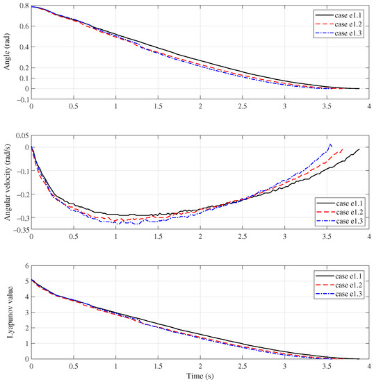 The experiment results are shown in Figure 12 and Figure 13. The upper two subfigures of Figure 12 present the motion responses of the manipulator. The black solid line, red dash line and blue dash-dot line correspond to the case e1.1, e1.2 and e1.3, respectively. It is clear that the control successfully steer the system to its equilibrium point in short time. The setting time are 3.884 s, 3.683 s and 3.562 s for the three cases, respectively. It can also been found that it takes less time for the case of payload uncertainty than the case of no payload. The bigger the payload uncertainty, the less the setting time. This is because that the angular trajectory of the manipulator tends to the terminal state in a monotonically-decreasing way. The gravity force always plays an active role during the falling of the manipulator. Similar with the simulations, the angular velocity curves also exhibit non-smooth feature.