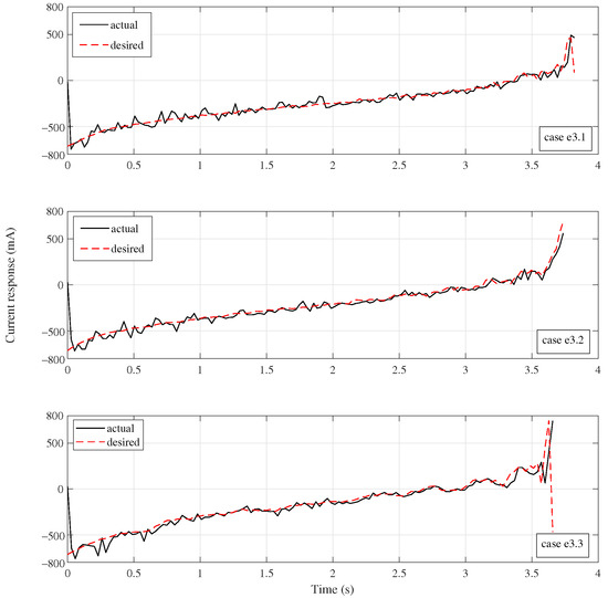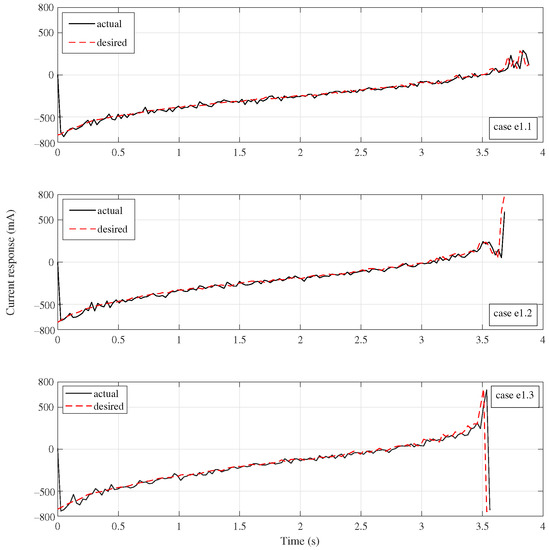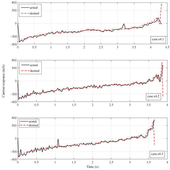 The system response and current response are shown in Figure 18 and Figure 19, respectively. Similarly, the black solid line, red dash line and blue dash-dot line in Figure 18 correspond to the case e4.1, e4.2 and e4.3, respectively. The black solid line and red dash line in Figure 19 depicts the actual and desired current, respectively.