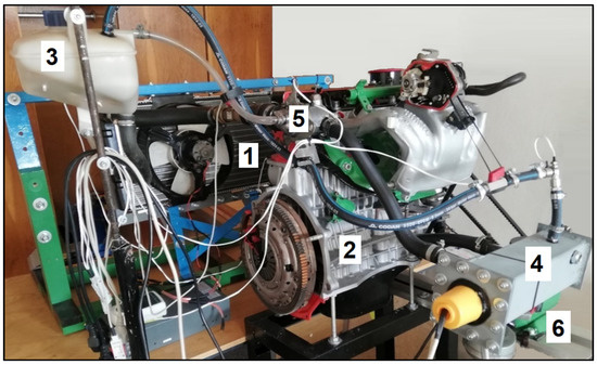 Experimental setup of the engine cooling circuit in the laboratory. 1—cooler with fan, 2—engine block of Škoda Felicia 1.3 MPI (50 kW) with water pump, 3—expansion tank, 4—heater, 5—thermostat, 6—electric motor.