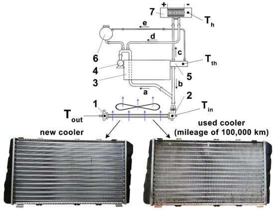 Experimental setup of the cooling circuit and car coolers investigated. 1—car cooler with fan, 2—cooler quick coupler, 3—engine block, 4—water pump, 5—thermostat, 6—expansion tank, 7—heater, a—coolant flow from the cooler to the water pump and engine block, b—coolant flow from the thermostat to the cooler, c—coolant flow from thermostat to the heater, d—heated coolant flow from the heater to the water pump and engine block, e—coolant flow from the thermostat to the expansion tank, Tin—coolant temperature sensor at the cooler inlet, Tout—coolant temperature sensor at the cooler outlet, Tth—coolant temperature sensor in the thermostat, Th—coolant temperature sensor in the heater.
