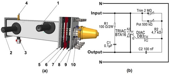 The electrical wiring diagram of the heater is shown in Figure 4b. The power supply and temperature control of the heating coil were handled by using a TRIAC BTA16 triac controller. Capacitor C2 was charged via resistor R2, trimmer Trim, and potentiometer Pot. When the voltage at its terminals reached the breakdown voltage of the diac (approximately 32 V), the diac went into a conductive state, and this voltage was connected to the control electrode G of the triac. This voltage pulse opened the triac. The voltage across the capacitor dropped, but the open triac remained open until the supply voltage dropped below the holding voltage. The greater the resistance of R2, the trimmer, and the potentiometer, the longer it took to charge the capacitor, so the triac was open for a shorter time. The trimmer was used for coarse adjustment of resistance while the potentiometer was used for fine adjustment and desired voltage regulation.