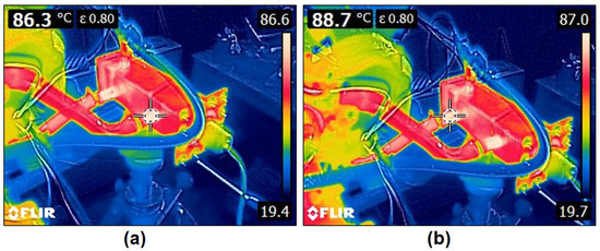 Thermal images of the heater inlet and outlet nozzles during coolant heating are shown in Figure 5. To achieve a coolant temperature in the thermostat above 80 °C, it is necessary to heat the coolant in the heater above 88 °C. The heater nozzles, on which the surface temperature was measured with a thermal imaging camera, had a matte black surface. This surface is the most accurate for thermal imaging measurements.