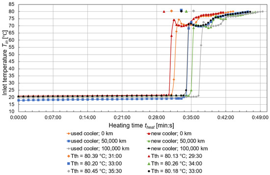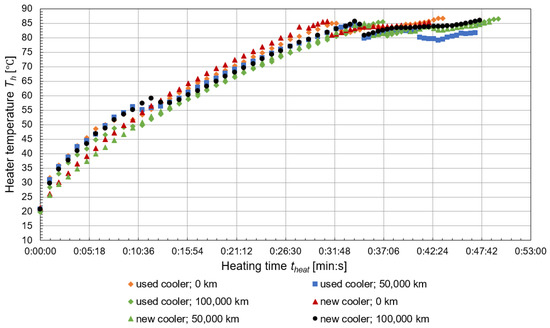 A comparison of the heating and cooling times of the coolant of the new cooler and the used cooler as their mileages were varied is shown in Figure 6 and Figure 7. The heating time varied depending on the mileage of the car cooler and the coolant of the vehicle. The coolant with a mileage of 0 km in the new cooler took the shortest time to heat up (41 min and 30 s) and conversely, the coolant with 100,000 km in the used cooler (100,000 km mileage) took the longest time to heat up (49 min and 30 s). The coolant gradually warmed from approximately 20 °C to 80 °C when the thermostat was opened and the coolant drained into the cooler. All coolants tested initially achieved a significant temperature rise in the range of 56 °C to 71 °C, then a slight decrease and a further temperature rise up to 80 °C. The thermostat temperature Tth when the thermostat was first opened for all examined cooler and coolant mileage is shown in dots (Figure 6). The cooling process in the car cooler took place from the first time the thermostat was opened, but only by free convection, because the coolant was already flowing into the cooler, but not at full mass flow. In general, the longer coolant warm-up was due to the engine idle revolution settings of 900 RPM. As the engine revolutions increased, the coolant warm-up time became shorter.