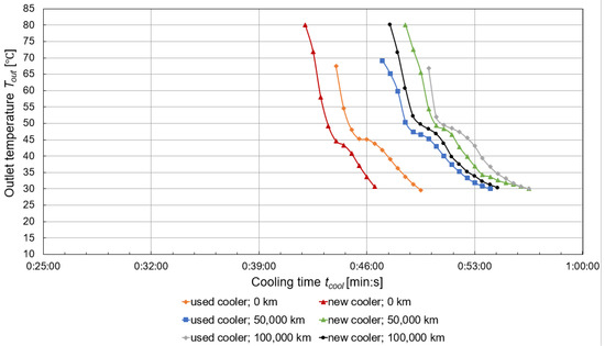 The cooling process was started by starting the fan and then recorded until the cooler outlet temperature was approximately 30 °C (Figure 7). In terms of cooling time, the new cooler and coolant with a mileage of 0 km cooled the fastest (4 min and 30 s), while the new cooler and coolant with a mileage of 50,000 km cooled the slowest (8 min).