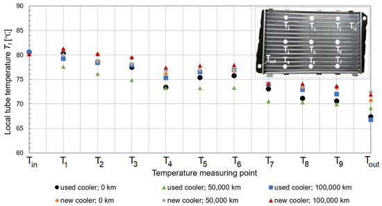 The local tube temperatures Tt at local points T1 to T9 and the inlet and outlet temperatures after the thermostat was fully opened and before the fan was started were recorded (Figure 9). The distribution of measurement points along the tubes was based on the direction of coolant flow (Figure 3). The new cooler and the used cooler with 0 km mileage of coolant flow maintained the highest temperature before the cooling process. This means that the new coolant (with a mileage of 0 km) maintained satisfactory physical properties for proper engine operation. On this basis, it can be concluded that coolant mileage is more important than cooler mileage. The combination of the used cooler and the used coolant further deteriorated the heat transfer properties of the coolant. Particularly in winter, it is necessary to maintain a suitable engine operating temperature.