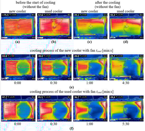 Thermal images recorded before, during, and after the cooling process of the new and used car coolers for coolant with a mileage of 0 km. (a) new cooler before the start of cooling without the fan; (b) used cooler before the start of cooling without the fan; (c) new cooler after the cooling without the fan; (d) used cooler after the cooling without the fan; (e) cooling process of the new cooler with fan; (f) cooling process of the used cooler with fan.