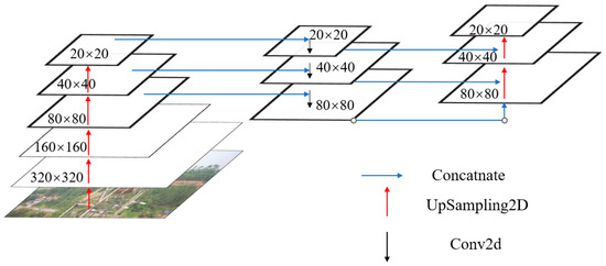 PANet uses the three feature layers of 80 × 80, 40 × 40, and 20 × 20 extracted by FPN to fuse bottom-up, which can obtain three fused features to improve the effect of target detection at different scales; the structure is shown in Figure 3.
