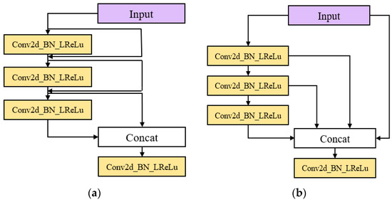 The OSA Block is an improvement on the Dense Block (whose structure is shown in Figure 4a) in the DenseNet [33,34]. It does away with the fusion method, where each layer aggregates the previous layer to avoid information redundancy. It takes the form of fusing all the previous layers at once in the last layer, so that the input size remains the same and new output channels can be expanded while reducing the number of parameters. The structure of the OSA Block is shown in Figure 4b.