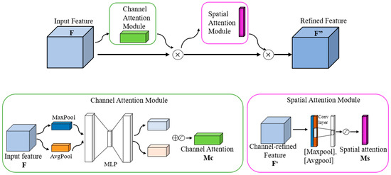 The total process of the operation of the CBAM module is shown in Equations (3) and (4).