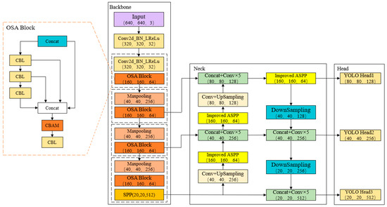In summary, the structure of the improved YOLOv5 algorithm is shown in Figure 8. After the input images pass through the feature extraction network, the OSA Block lets the information from the upper to lower layers intersect without losing the core information. After the information intersection, CBAM recalibrates the target feature information and amplifies the target weights to obtain three effective feature layers of different sizes, enhancing the detection of small targets. The feature fusion network is improved with the ASPP module to enhance the perceptual field of each input feature layer. Combining information from different scale feature layers provides the basis for improving the detection accuracy of the model for targets in complex backgrounds.