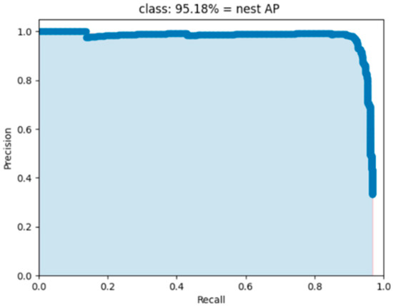 The P–R curve plotted with Recall as the horizontal axis and Precision as the vertical axis is integrated to find the area under the curve as mAP, denoted as S, as shown in Equation (7). The P–R curve for the improved model in this paper is shown in Figure 10.